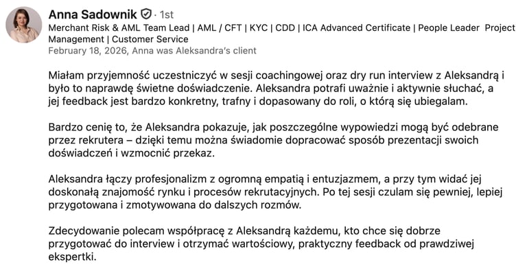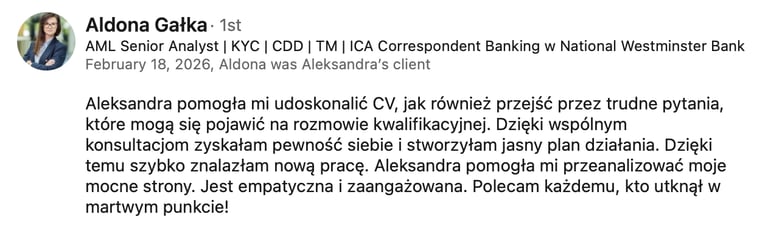 Nazywam się Aleksandra i wspieram osoby, które chcą podejmować świadome decyzje dotyczące pracy i życia, szczególnie w momentach zmiany, rozmów rekrutacyjnych i wyboru nowego kierunku zawodowego.