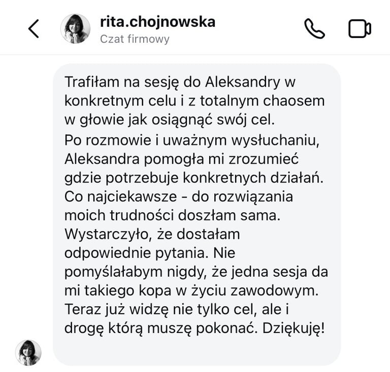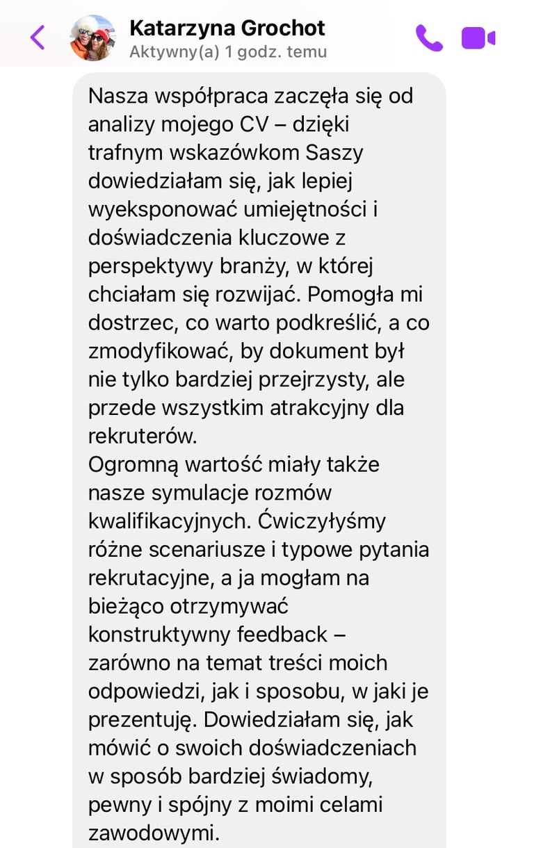 Pracuję z osobami na różnych etapach życia i kariery – zarówno z tymi, którzy szukają nowych wyzwań zawodowych, chcą rozwijać się w międzynarodowych korporacjach, jak i z expatami w Polsce, którzy pragną odnaleźć równowagę i jasność w nowym otoczeniu.